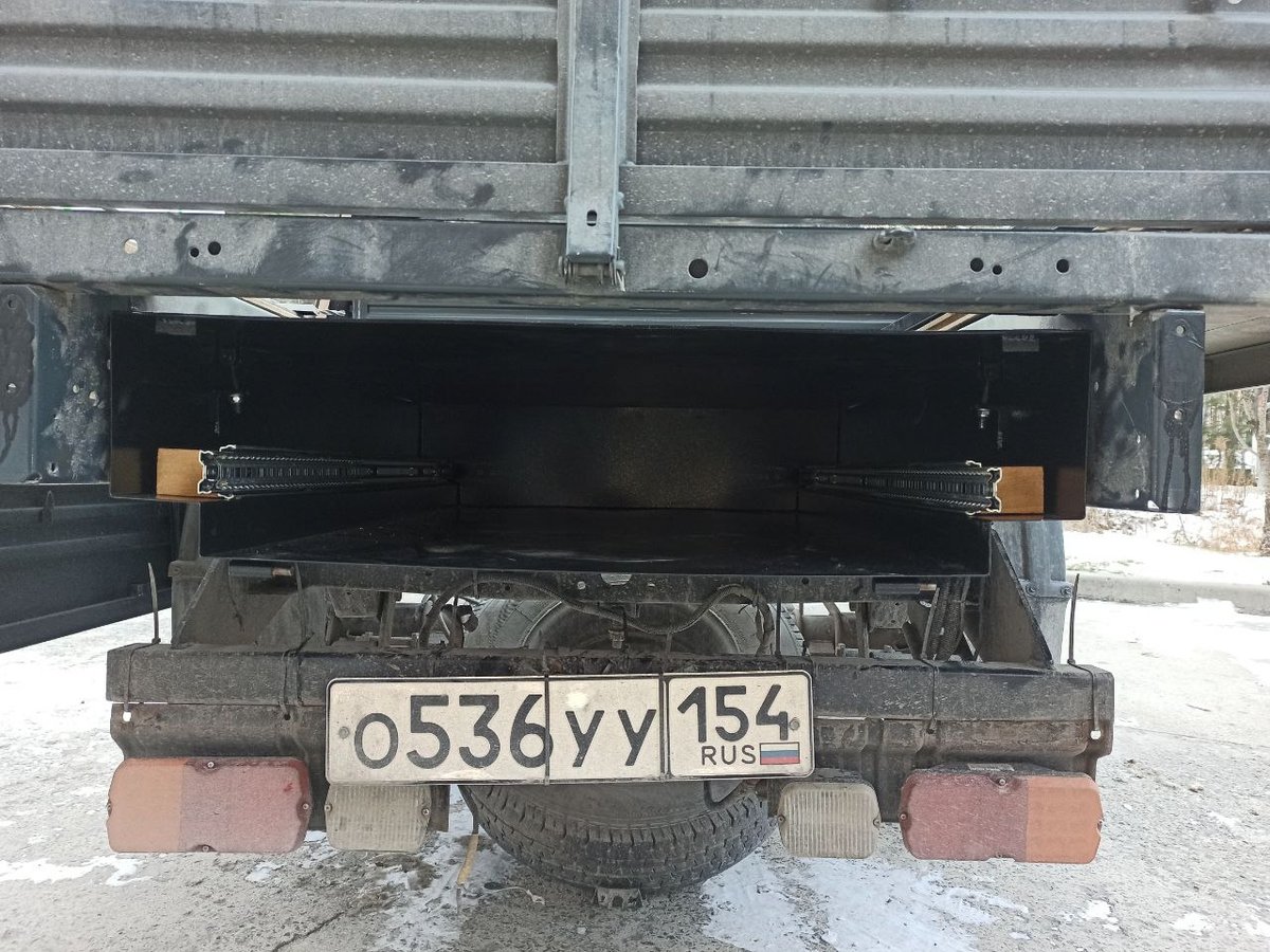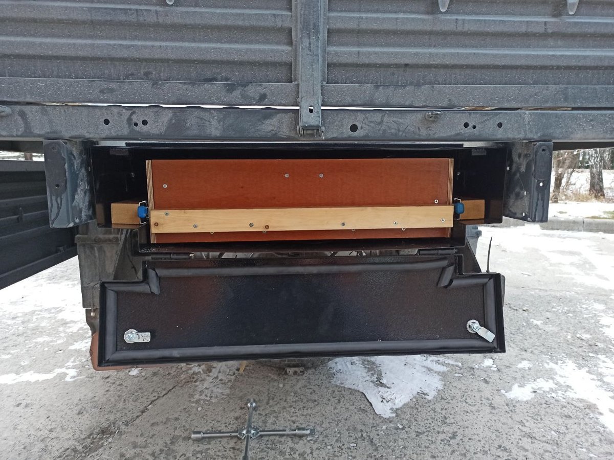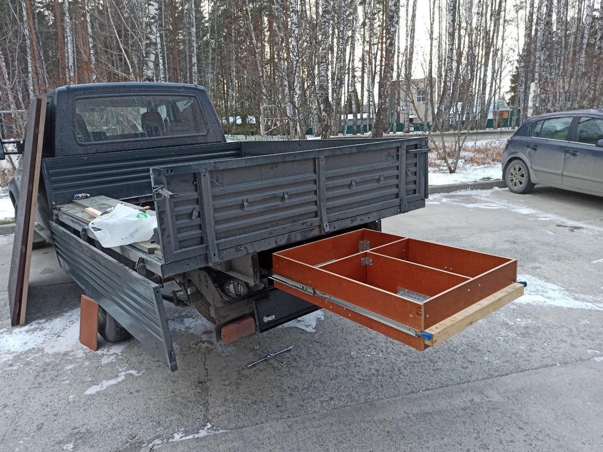 В этот раз подвесные ящики выполнены полностью по нашим чертежам и под нашим контролем. Центральный задний ящик и выдвижная кухня-стол в нём доведены до ума. Кухню-стол, как и раньше, можно вынуть целиком и отнести на приятное место. А можно просто выдвинуть на телескопических направляющих, и использовать так. Осталось только столешницу навесить и номерной знак вернуть на место.