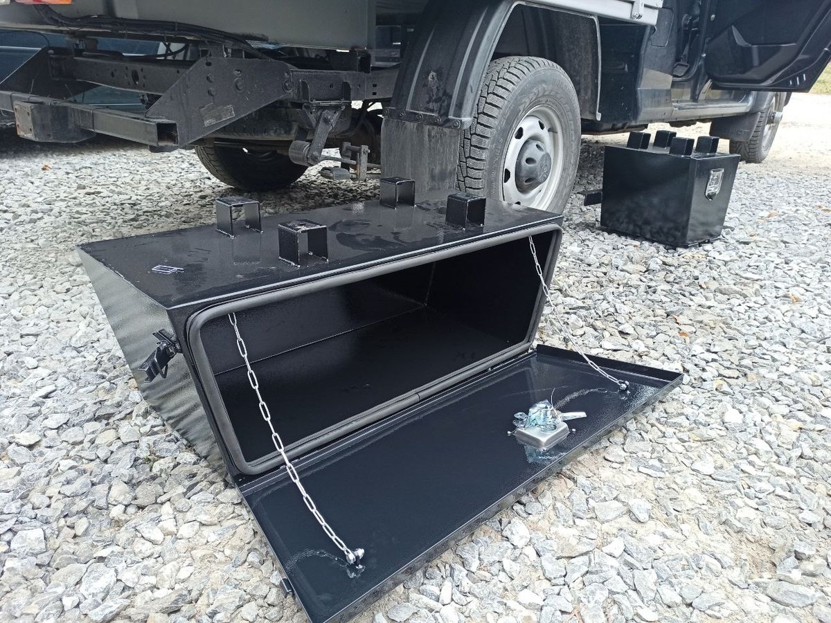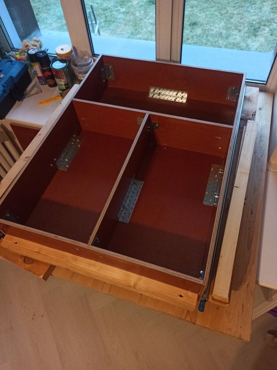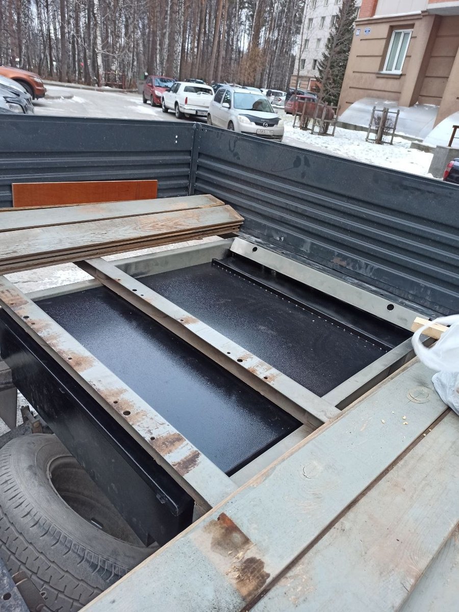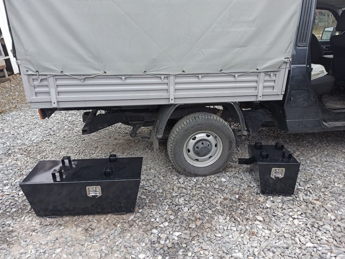 В этот раз подвесные ящики выполнены полностью по нашим чертежам и под нашим контролем. Центральный задний ящик и выдвижная кухня-стол в нём доведены до ума. Кухню-стол, как и раньше, можно вынуть целиком и отнести на приятное место. А можно просто выдвинуть на телескопических направляющих, и использовать так. Осталось только столешницу навесить и номерной знак вернуть на место.
