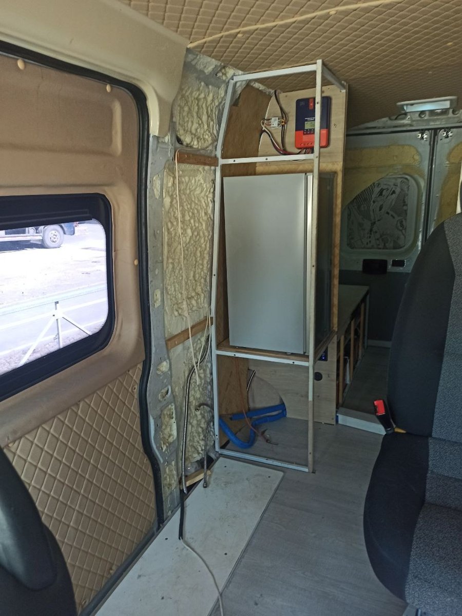 Между тем, работы по Фиату в самом разгаре. Вставили два окна, сделали багажник и уличные фонари, переварили бак сточных вод, врезали заливную горловину для чистой воды, поставили привод сдвижной двери, разобрали всю мебель и уже начали собирать и красить новую.