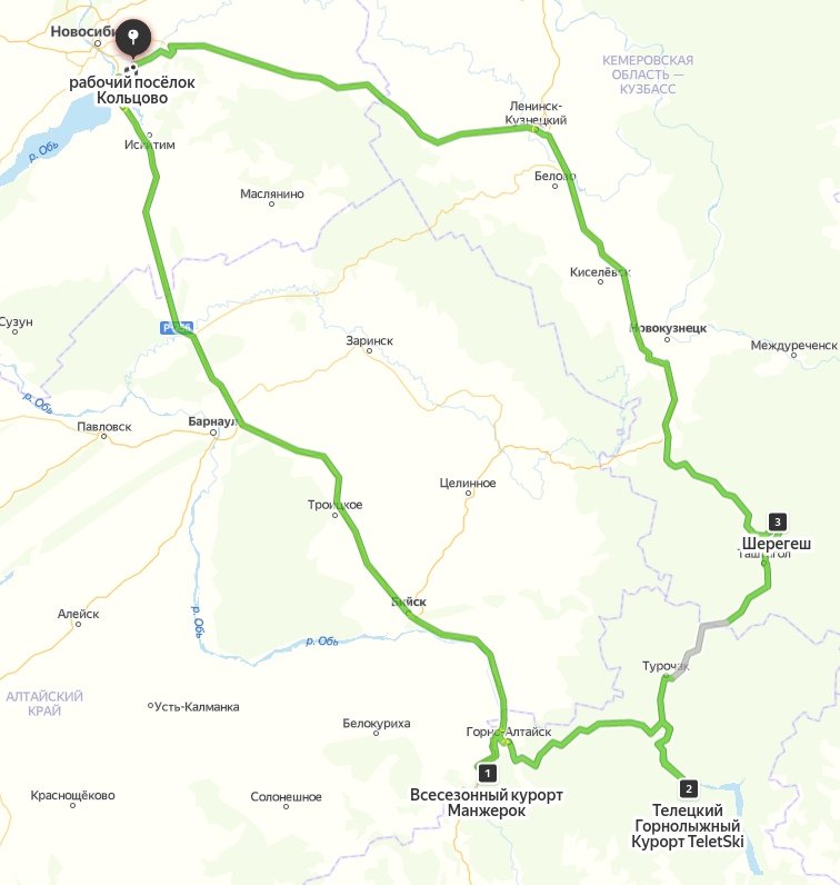 И вот на прошедших выходных, совершенно незапланированно и неожиданно для самих себя, мы взяли да и опробовали этот маршрут. Времени у нас было немного, всего три ночи и четыре дня, так что проехали в сокращённом виде: Новосибирск - Манжерок - Телецкое - Шерегеш - Новосибирск. Но в общем-то по расстоянию это почти всё кольцо и есть.