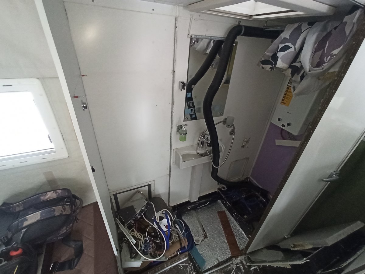 В Гризлике разбухли от влажности мебельные щиты в районе санузла. Будем менять на влагостойкую фанеру. Не так-то просто оказалось разбирать мебель с кучей навесного оборудования в тесном помещении. Но мы справились.
