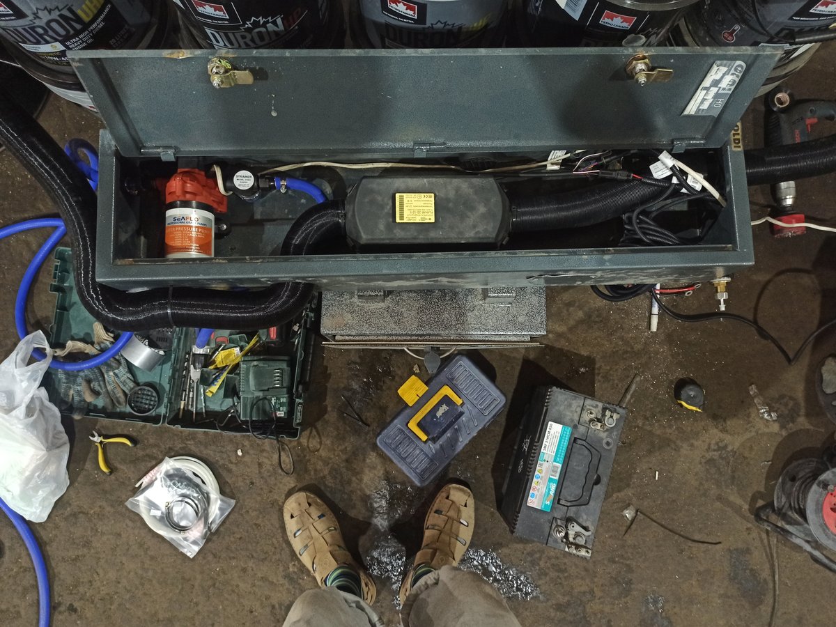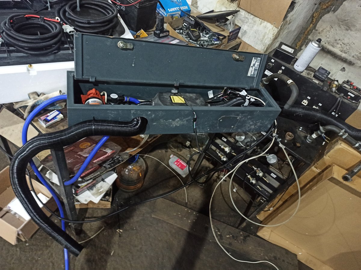 В общем, ящичек начинён оборудованием, испытан на специальных стендах с водой и соляркой, смонтирован на своё место. Пульт управления и воздуховоды выведены в жилой отсек. Бачок с дизелем устроился в одном из подвесных ящиков.